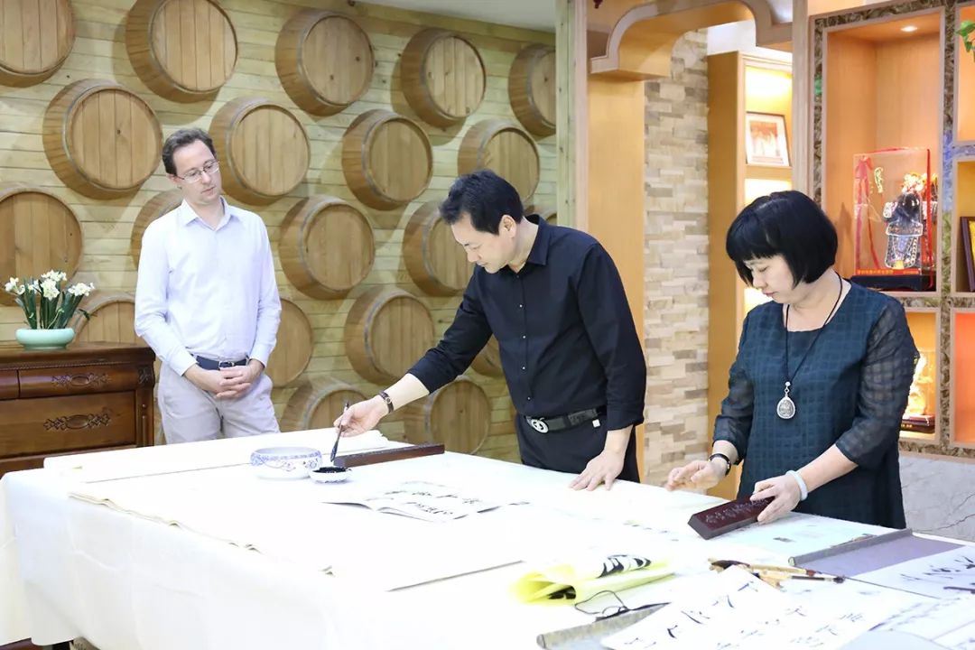 图为吴董事长以中国书法欢迎南部酒庄的Jean-Baptiste VIDAL先生
