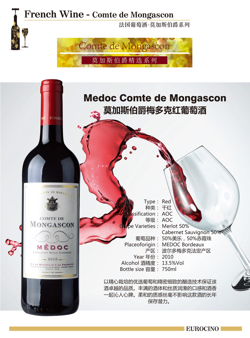 葡萄品种:Merlot 50% + Cabernet-Sauvignon 50% 50%美乐,50%赤霞珠