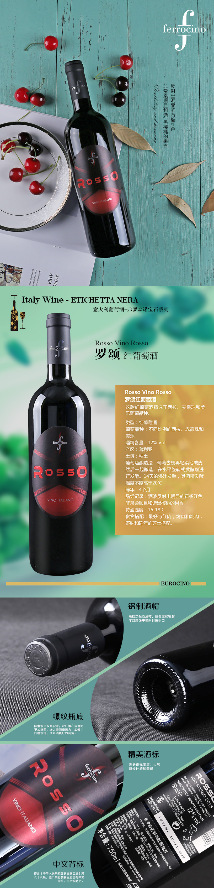 类型:半干 Semi-Dry 产区:意大利ITALY 酒庄:弗罗森诺酒庄 年份:2013/2014 酒精度:12%vol 容量:750ml 葡萄品种:赤霞珠Cabernet Sauvignon美乐Merlot 品酒师品鉴:酒液反射出明显的石榴红色,非常柔顺且和谐黑樱桃的果香。